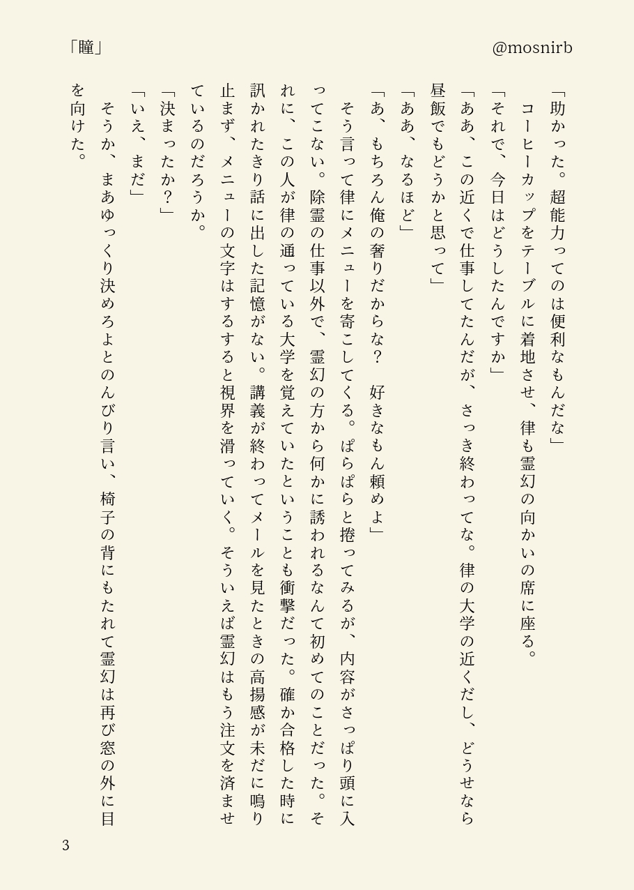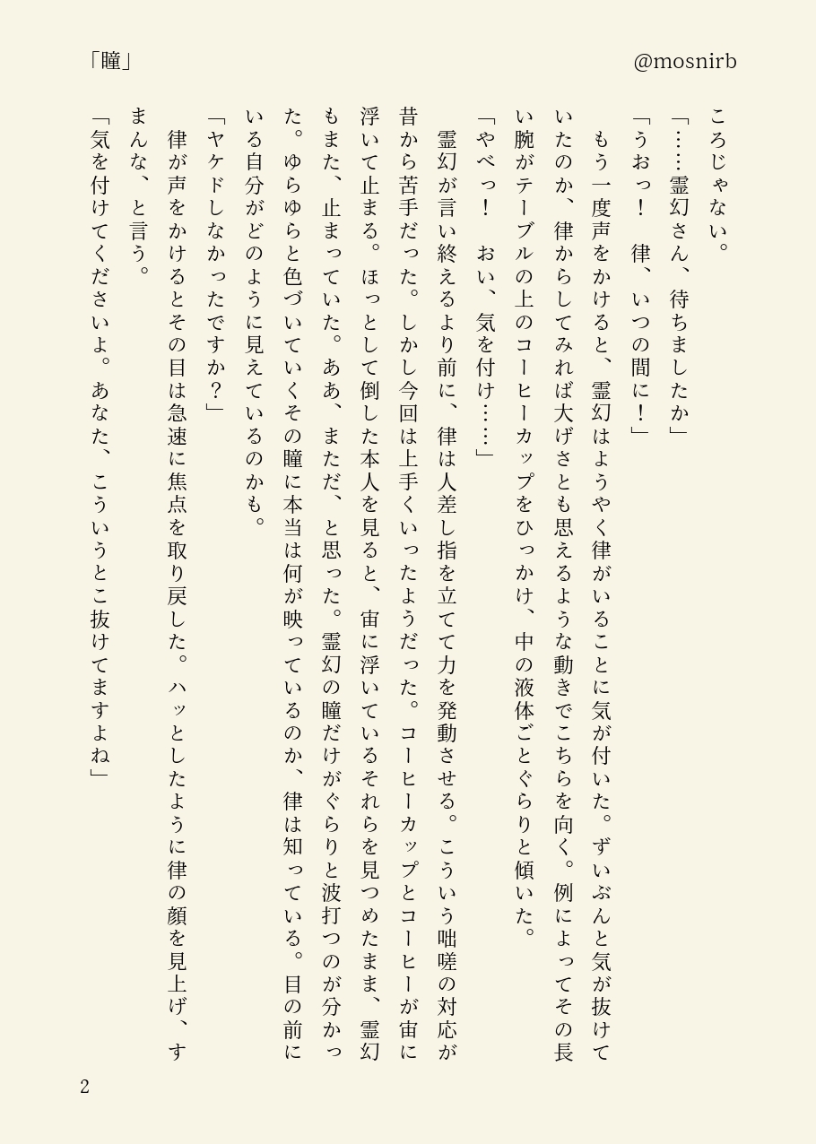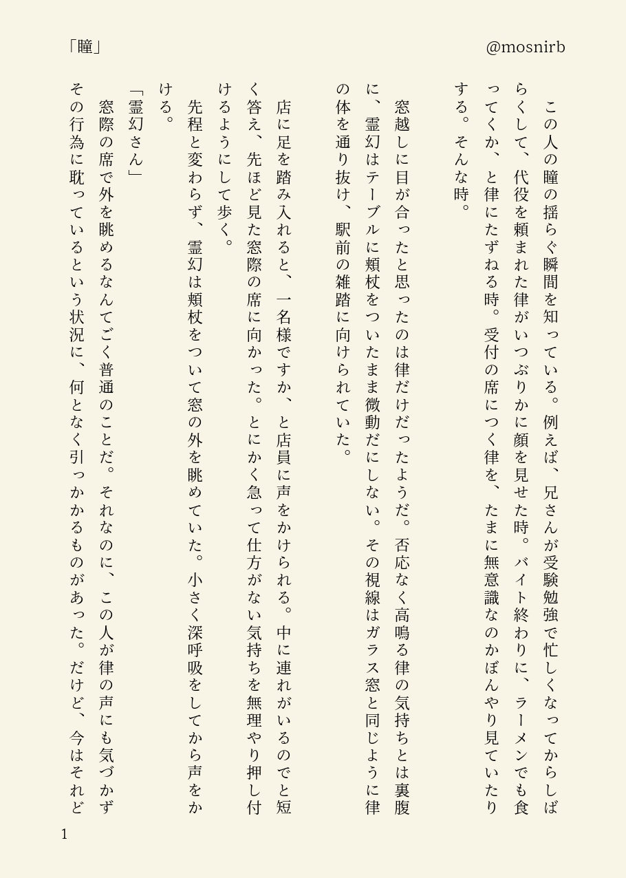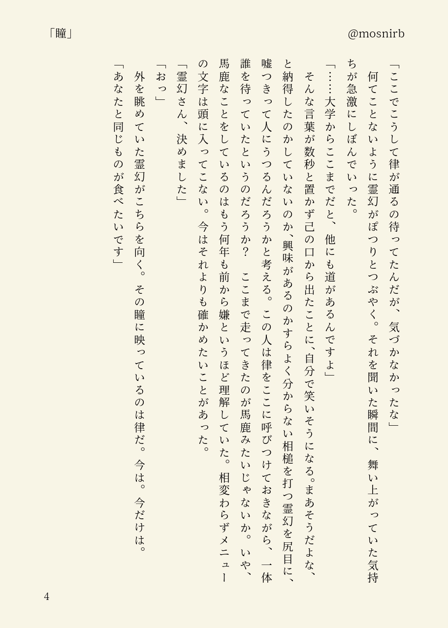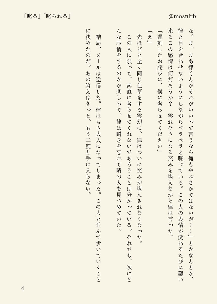 律霊。疲れからか、不幸にも深夜にやおい漫画を書き殴ってしまう……